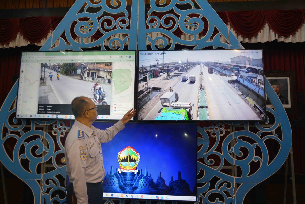 lihatfoto.com (Semarang) – Kesibukan Petugas gabungan saat memantau pergerakan kendaraan di Posko Terpadu Lebaran 2026 yang terpusat di Kantor Dinas Perhubungan Provinsi Jawa Tengah, Kawasan Krapyak Semarang, Jumat (13/3/2026).Dinas Perhubungan Provinsi Jawa Tengah mengoperasikan posko terpadu layanan dengan menyiagakan petugas gabungan untuk memantau pergerakan arus lalu lintas mudik Lebaran 2026 melalui sistem CCTV selama 24 jam yang terpasang di sejumlah titik.***
