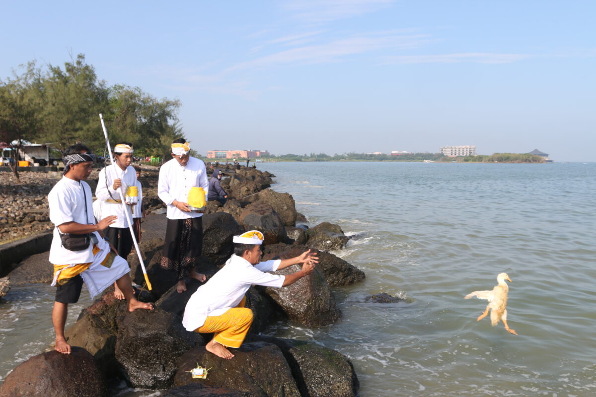 Di bibir pantai Marina Semarang, umat Hindu mempersembahkan hewan bebek putih yang melambangkan penyucian kotoran atau energi negatif yang melekat pada manusia dan alam.