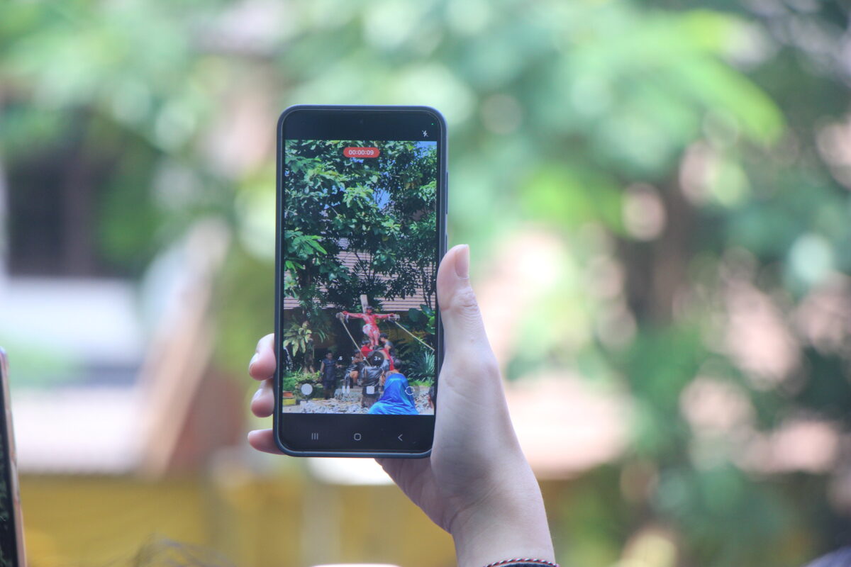 lihatfoto.com (Semarang) – Sejumlah umat merekam dengan gawainya saat penderitaan Yesus dalam visualisasi Jalan Salib yang digelar di halaman Gereja St Theresia, Paroki Bongsari Semarang, Jumat (3/4/2026). Ada beberapa umat tidak kuat menahan linangan air mata saat melihat adegan visualisasi ini.***